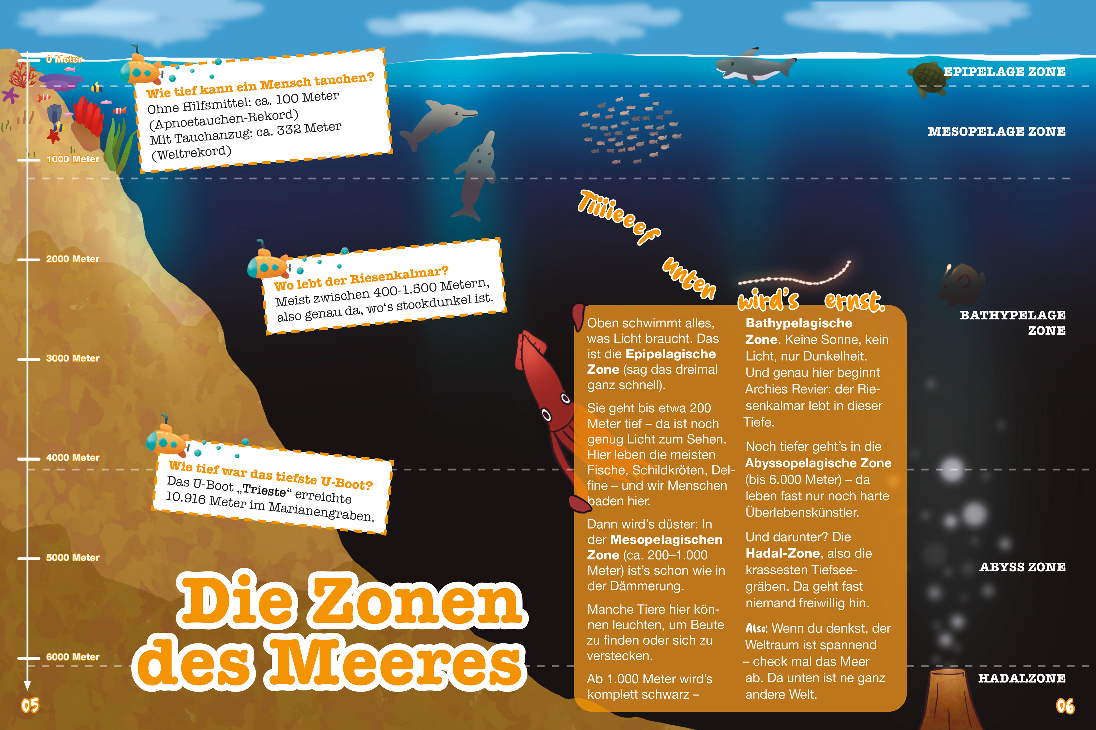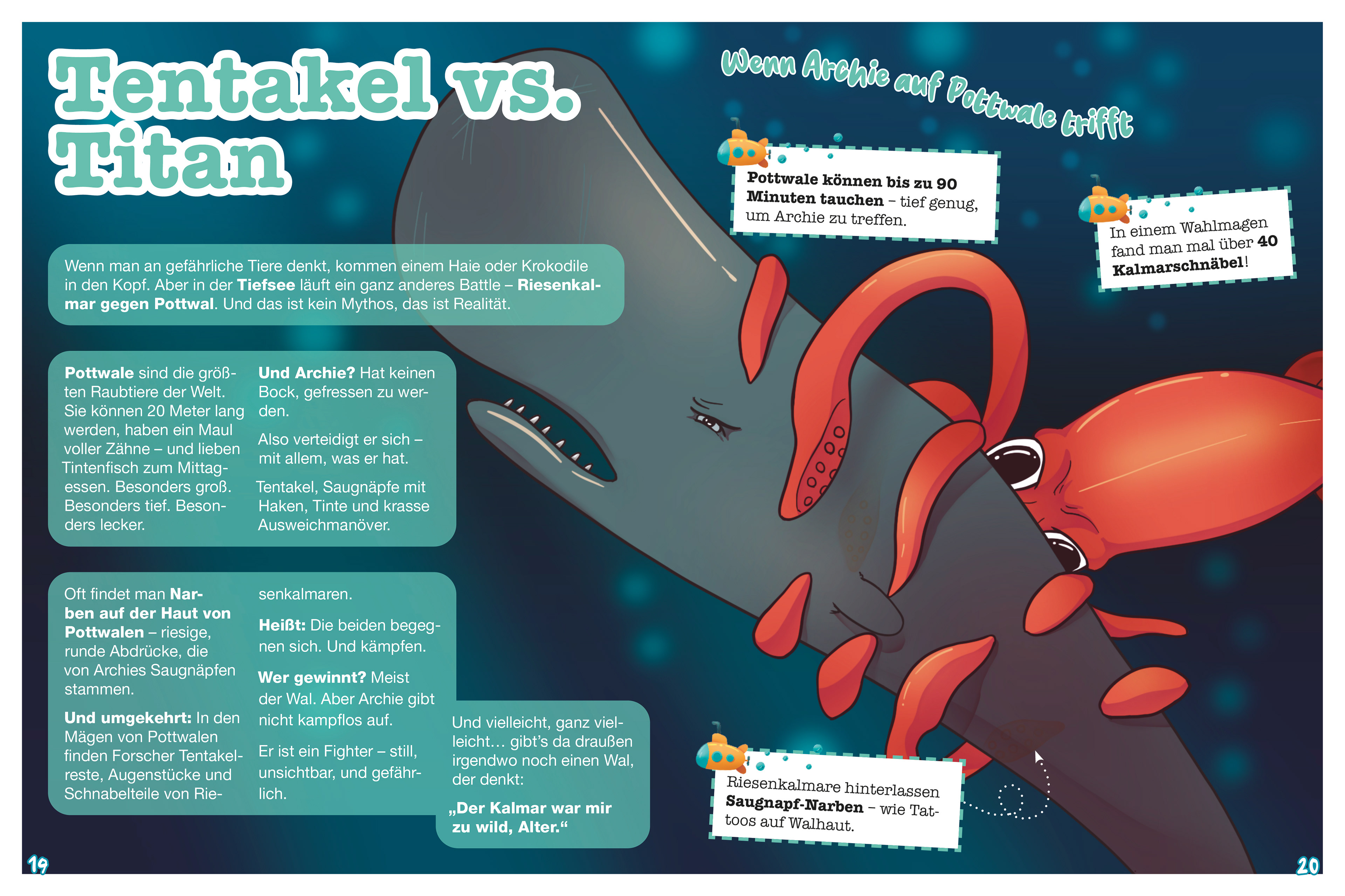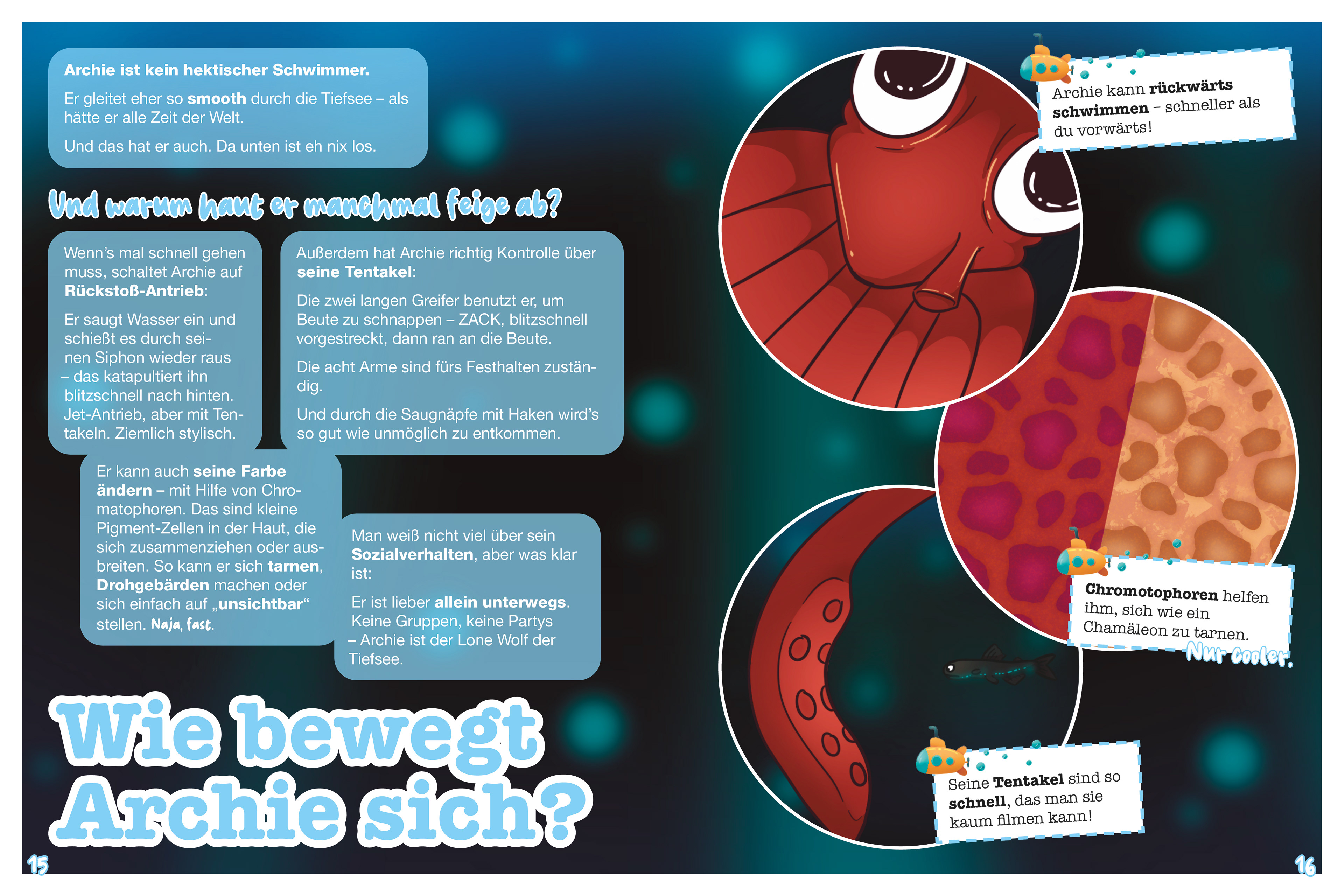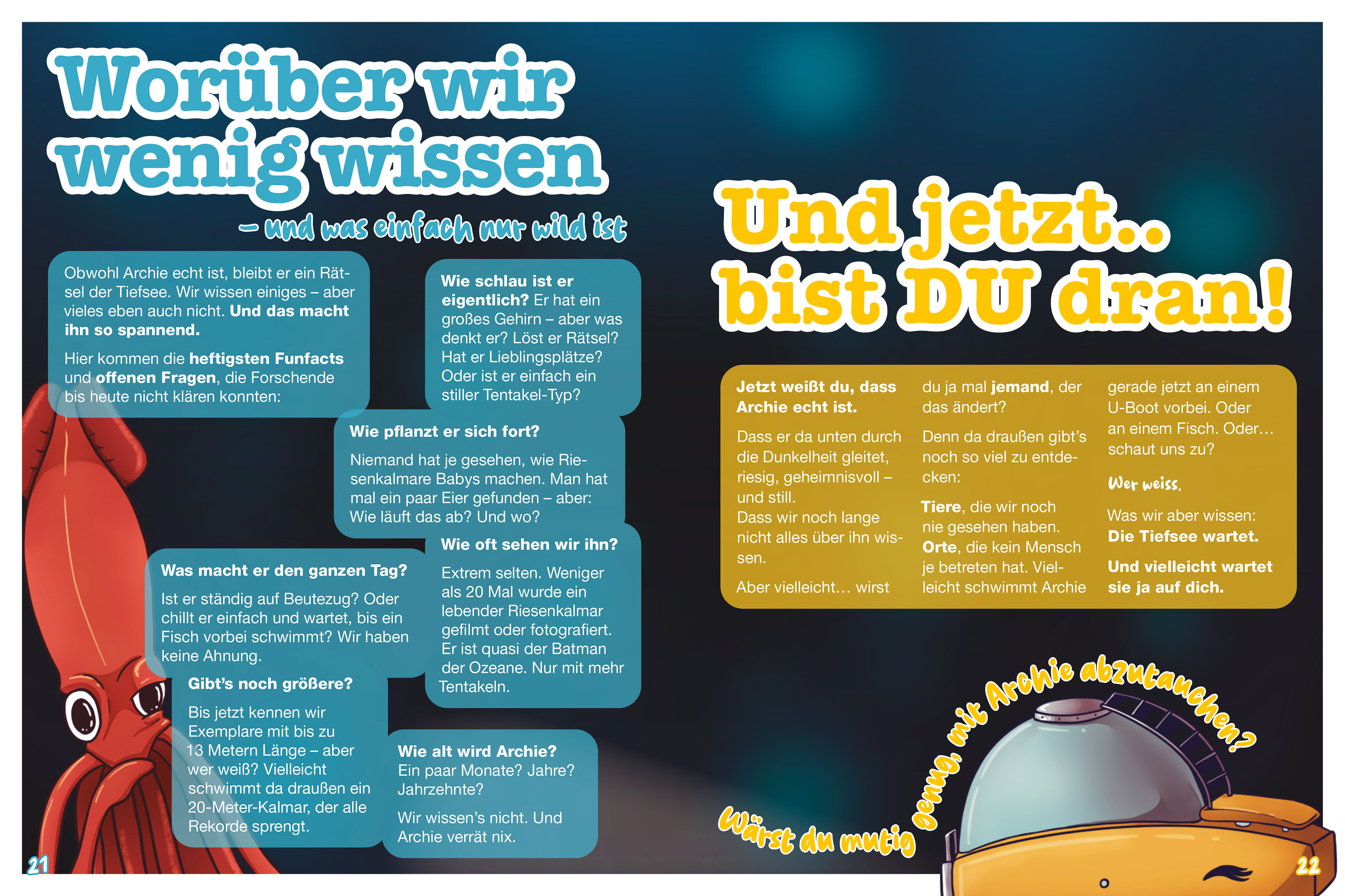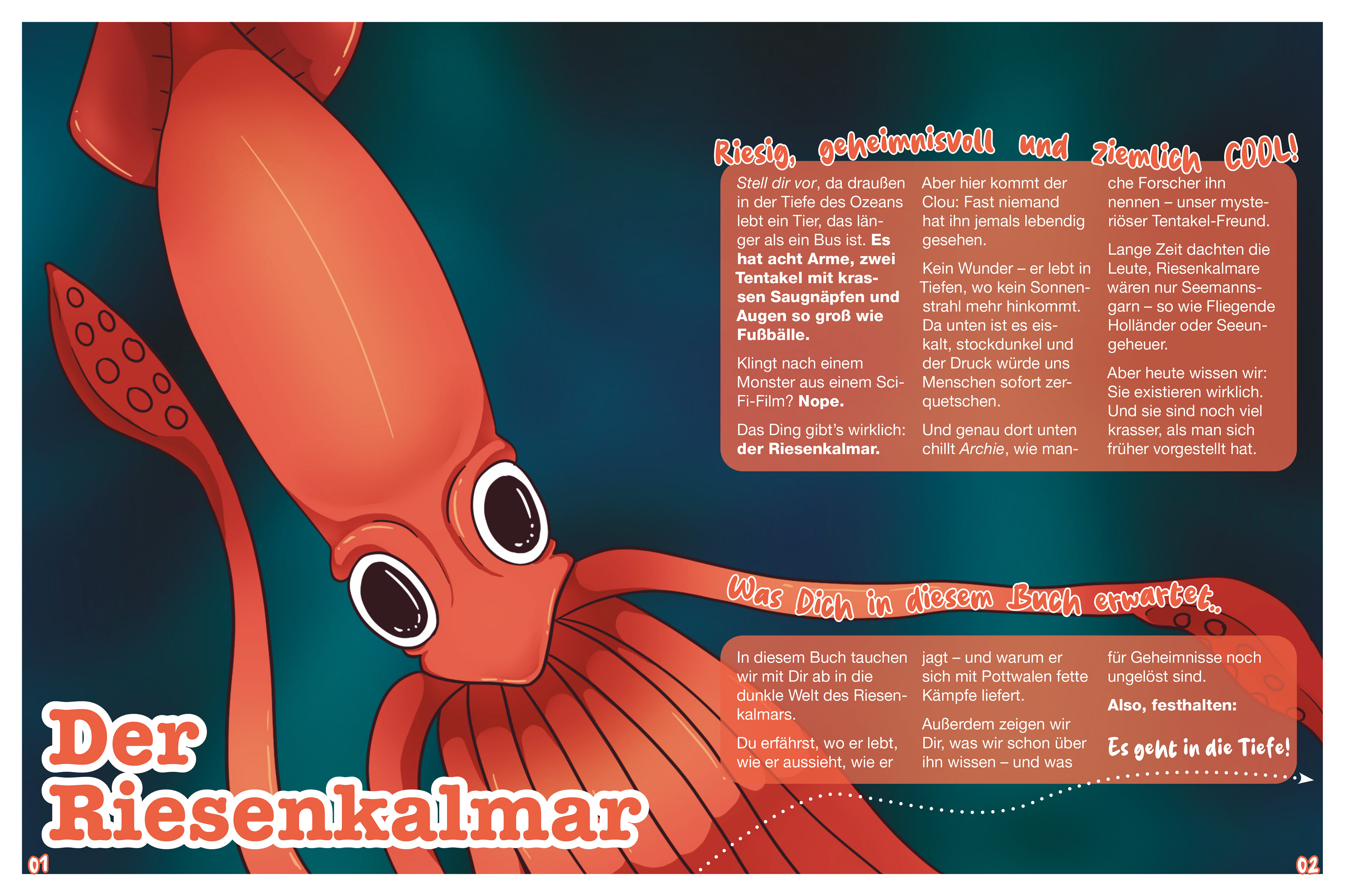 Im 2. Semester durften wir im Grafik Design Kurs zusammenhängend mit dem Motion Design Kurs ein eigenes Thema in ein fertiges Buch umsetzen. Beim Brainstormen bin ich dann schnell zu dem Entschluss gekommen, ein Kinderbuch gestalten zu wollen. Der Riesenkalmar ist mir dabei besonders hängen geblieben, da es sehr wenige Bücher über ihn gibt – vor allem für Kinder.
