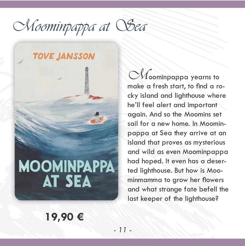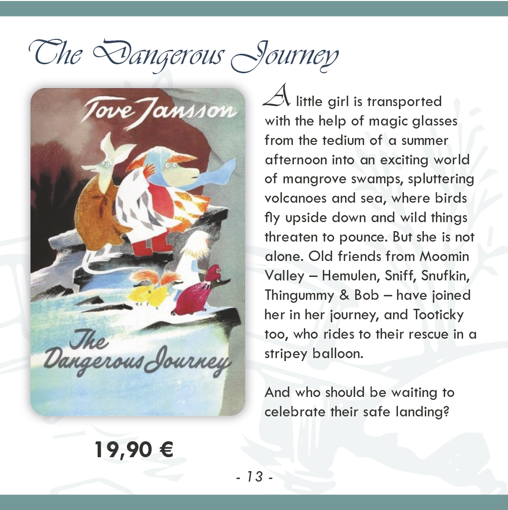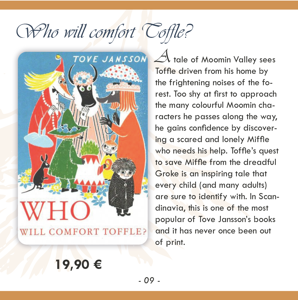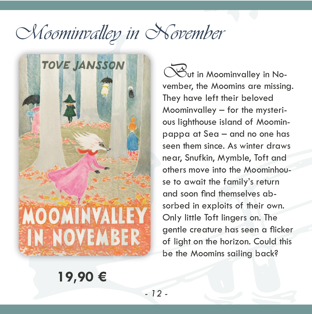 Für die Gestaltung setzte ich auf die Schrift Vivaldi in den Überschriften und TW Cen MT Std im Fließtext. Transparente Illustrationen von Tove Jansson sowie farbige Streifen am Seitenrand schaffen einen spielerischen Doppelseiten-Effekt und geben dem Katalog einen warmen, heimeligen Charakter.