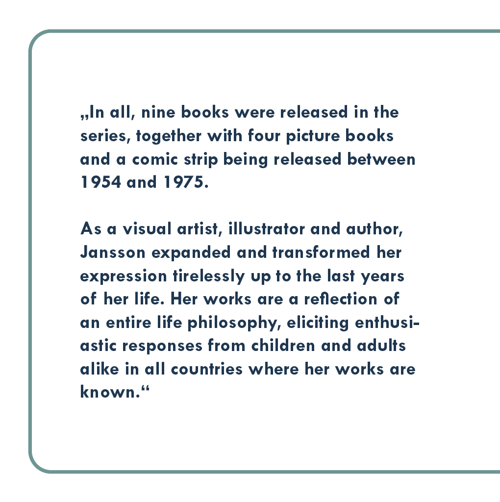 Da die Moomins für mich persönlich eine Herzensangelegenheit sind und ich sie stark mit meiner Kindheit verbinde, war es mir wichtig, dieses Thema in meine Mappe einzubringen.