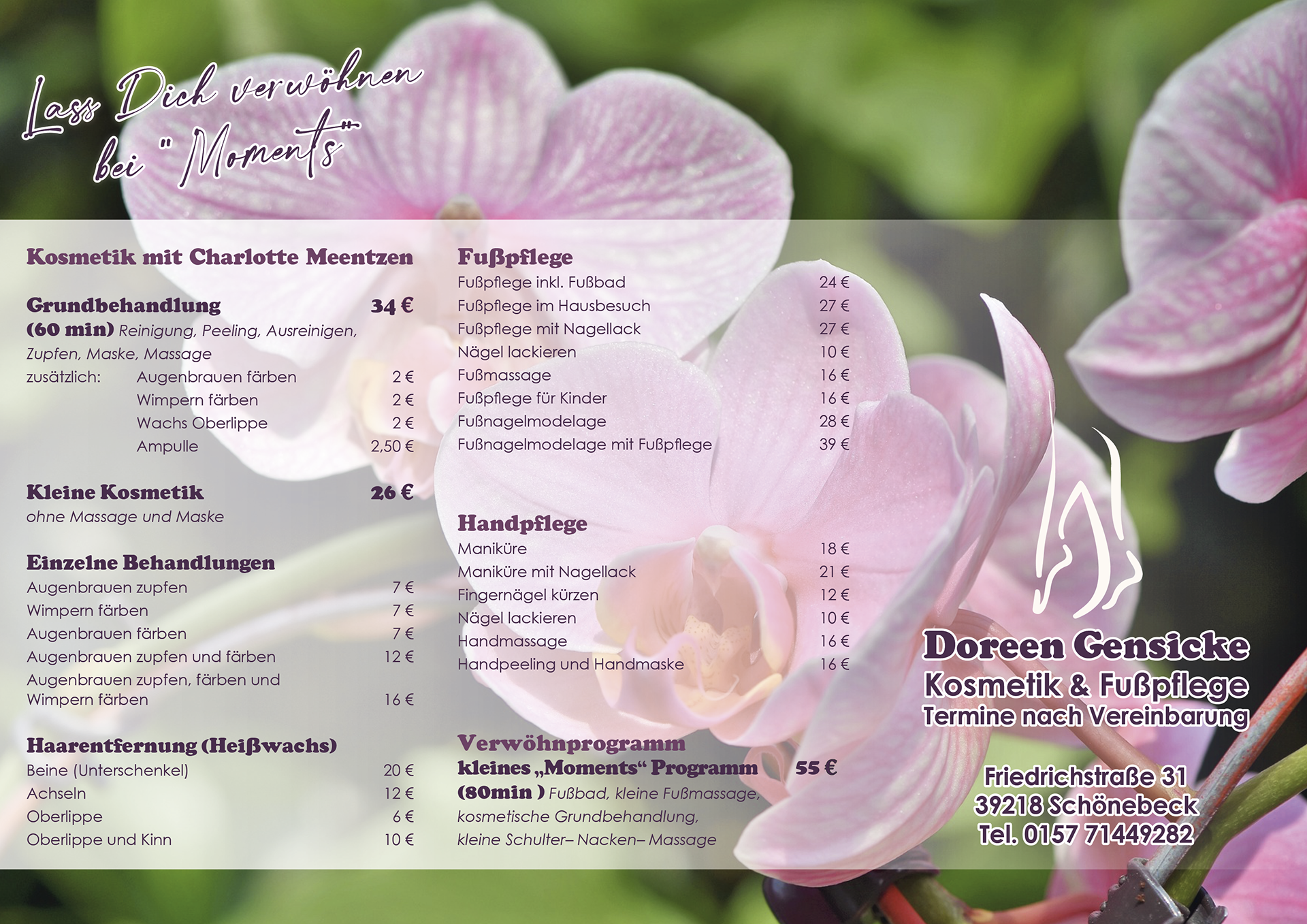 Einer meiner ersten Aufträge: Ein Produktflyer für das Kosmetikstudio Moments.