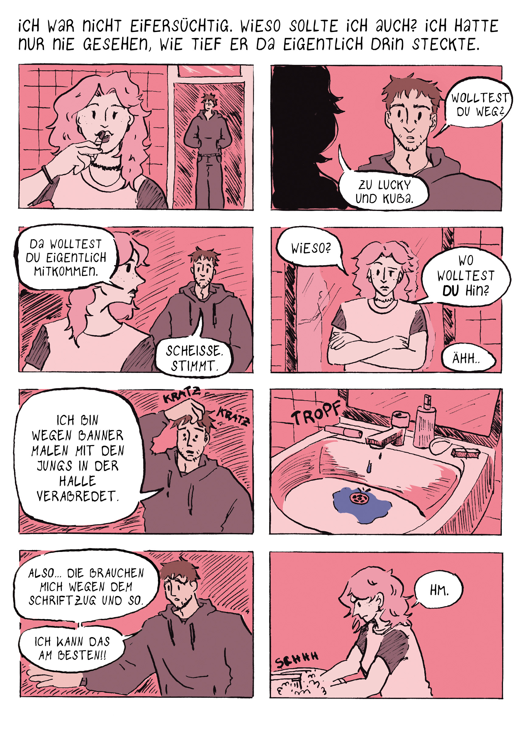 Dafür zeichnete ich das Lineart mit Tinte und scannte diese Reinzeichnungen im Anschluss ein. Die digitalen Farben setzte ich mit Procreate ein.