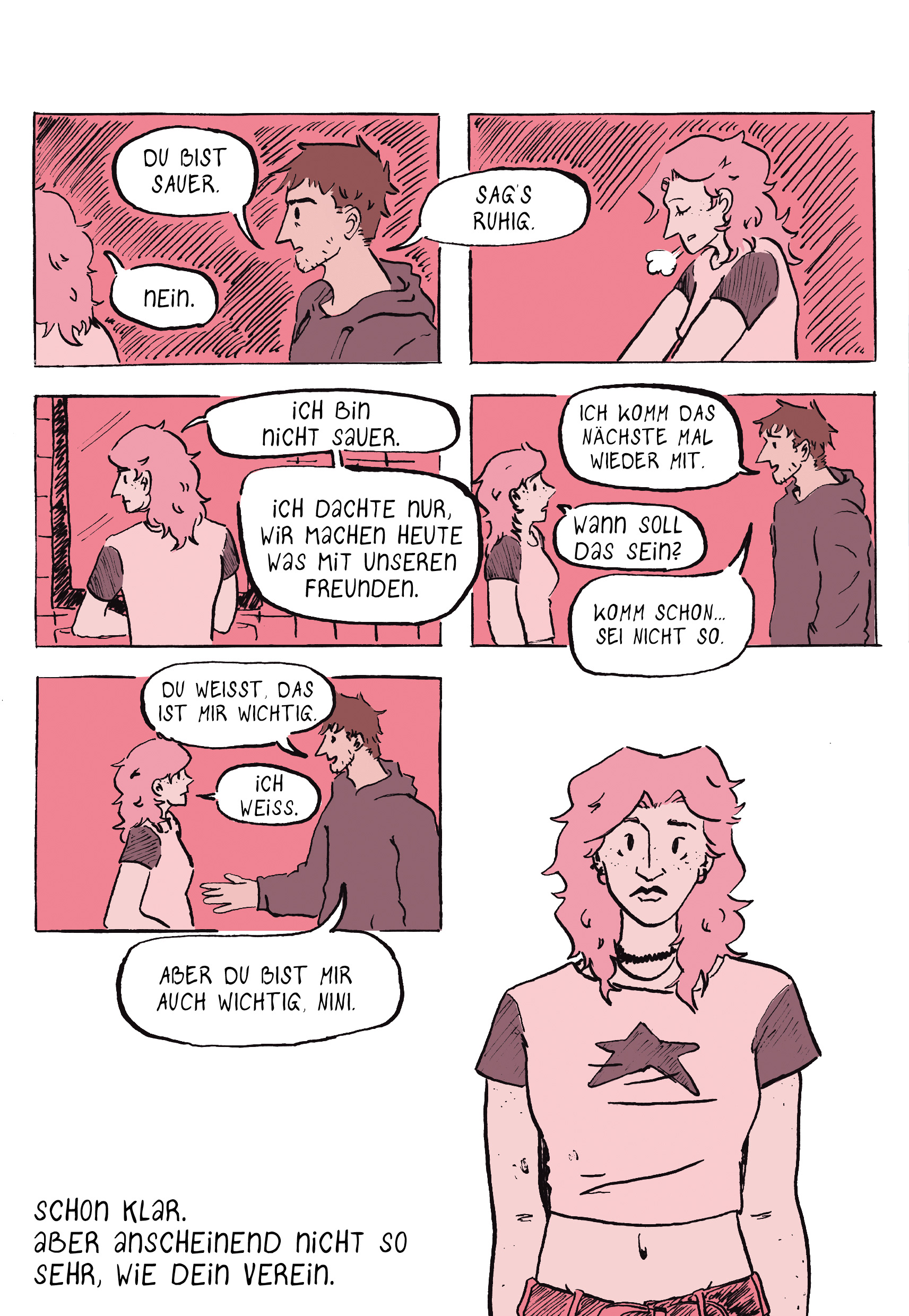 Einmal die innere/Dialog-Stimme von Nina selbst und dann die, der anderen Charaktere. Dabei war mir besonders wichtig, sie zwar verschieden zu machen aber nicht zu fremd voneinander aussehen zu lassen. Sie sollten miteinander harmonieren. Nina sollte ihre eigene Stimme auch in Form einer eigenen Font bekommen, die genau ihrer Persönlichkeit entspricht.